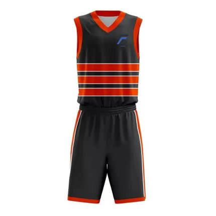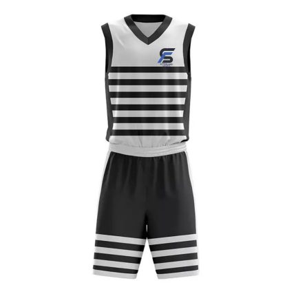 Discover premium basketball uniforms from Fitterland Sports, the leading manufacturer of high-performance basketball uniforms designed for champions. Fitterland Sports black and white basketball uniform fully custom cut-and-sew sublimated sleeveless V-neck jersey with bold horizontal black stripes, solid black side panels, and matching black shorts featuring white elastic waistband and triple white leg stripes. Perfect reversible or single-layer teamwear for elite performance and timeless style.