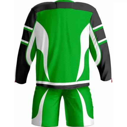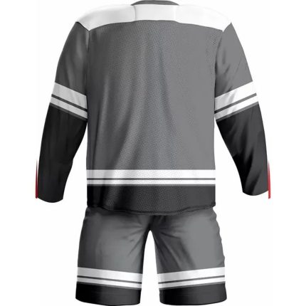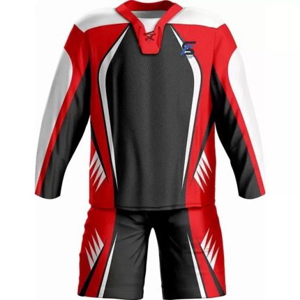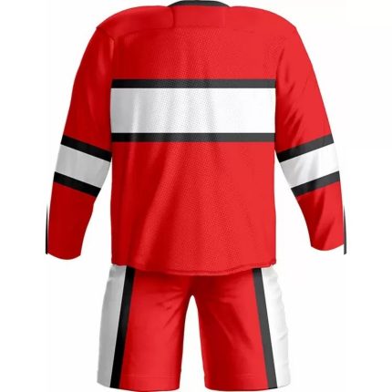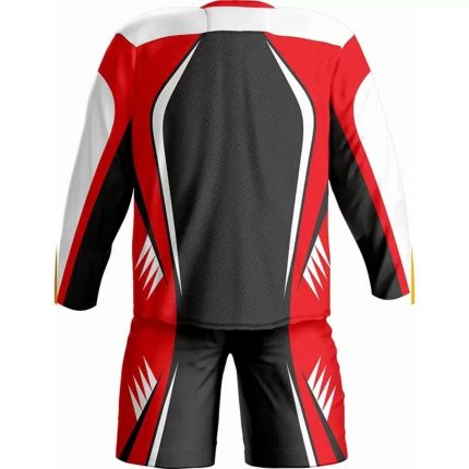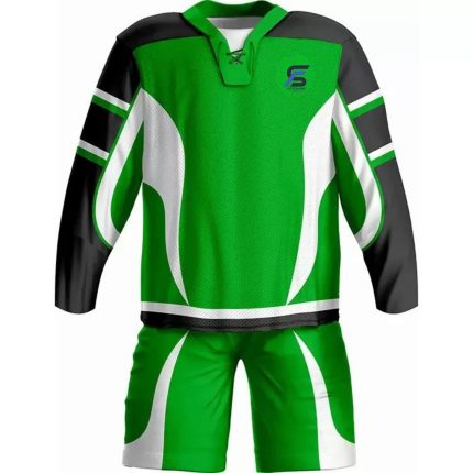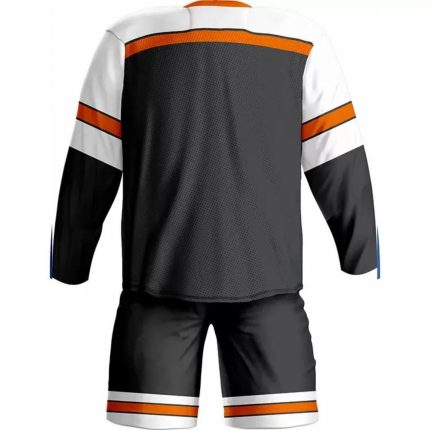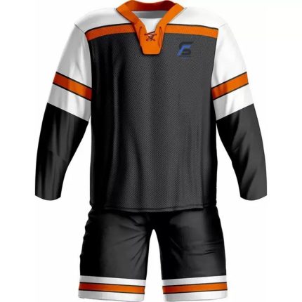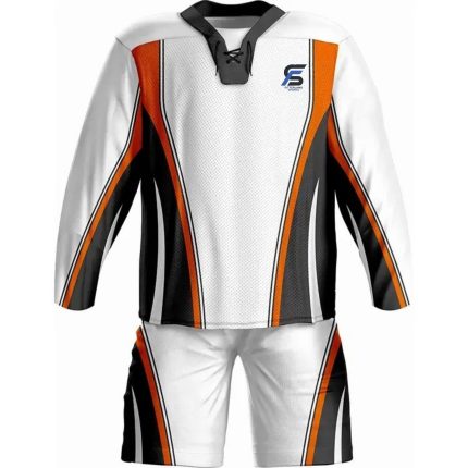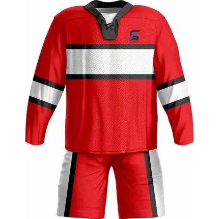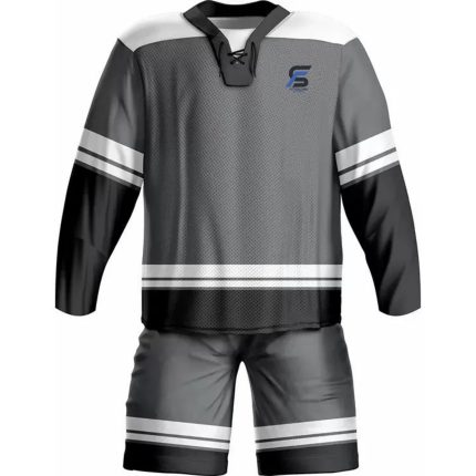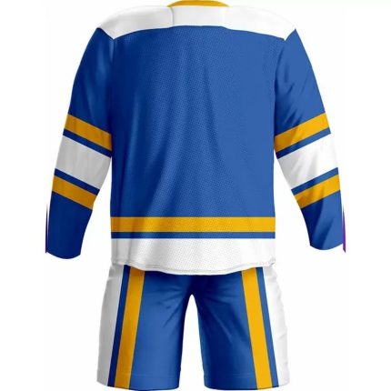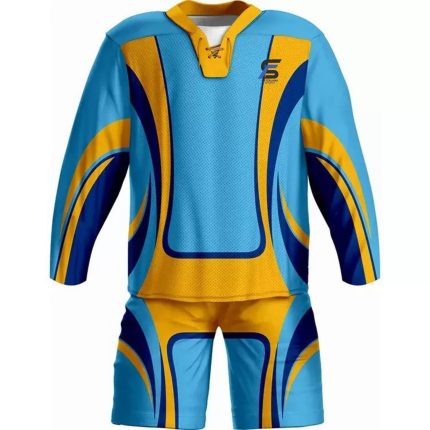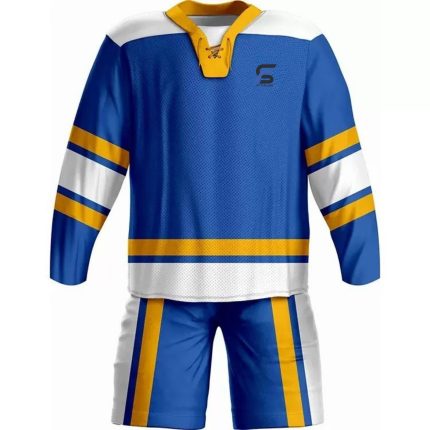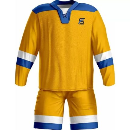 Discover premium ice hockey uniforms from Fitterland Sports, the leading manufacturer of high performance ice hockey uniform designed for champions. Fitterland Sports royal blue ice hockey uniform with white shoulders, yellow-gold lace-up V-neck, and bold horizontal stripes. Custom cut-and-sew ice hockey jerseys and matching shorts deliver unmatched style and performance.