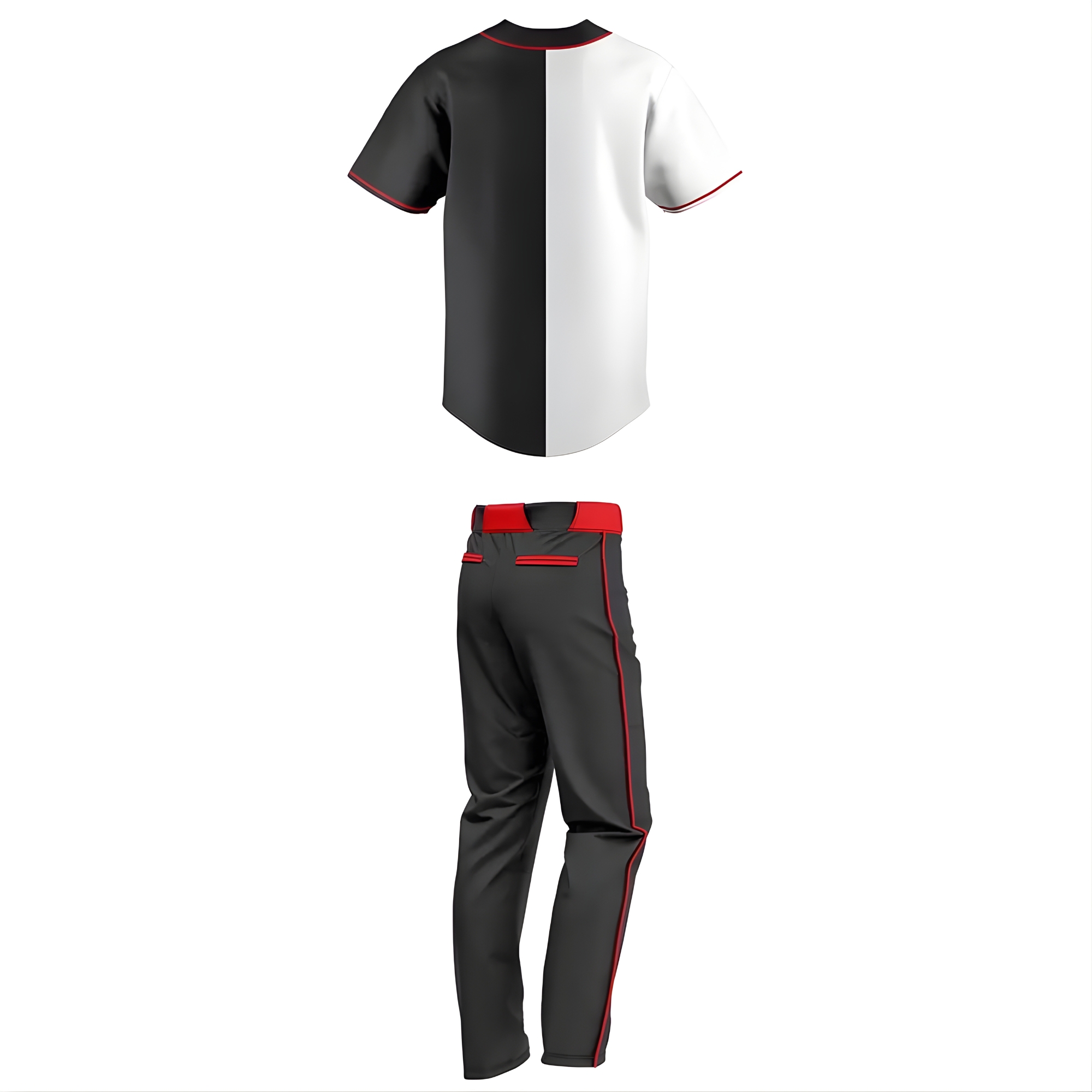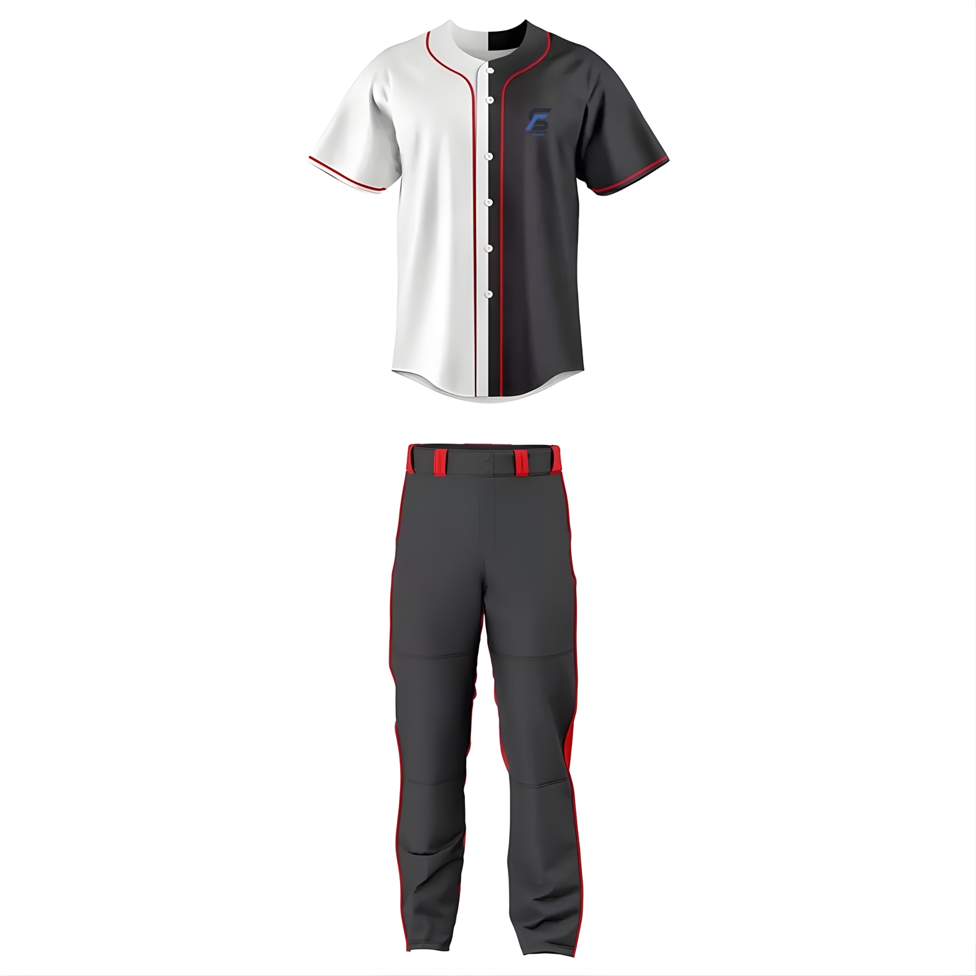 Fitterland Sports, a premium baseball uniforms manufacturer, presents its signature red and black baseball uniform. Fitterland Sports cut & sew custom baseball uniform two-piece features a dramatic vertically split short-sleeve jersey fiery red on the left, deep black/dark gray on the right fastened by a full button-front closure outlined in razor-thin yellow trim that continues around the collar and sleeve cuffs for a sharp, professional finish. Every detail is crafted by using advanced cut and sew construction to ensure perfect color blocking, durability, and an athletic fit that moves with the player.