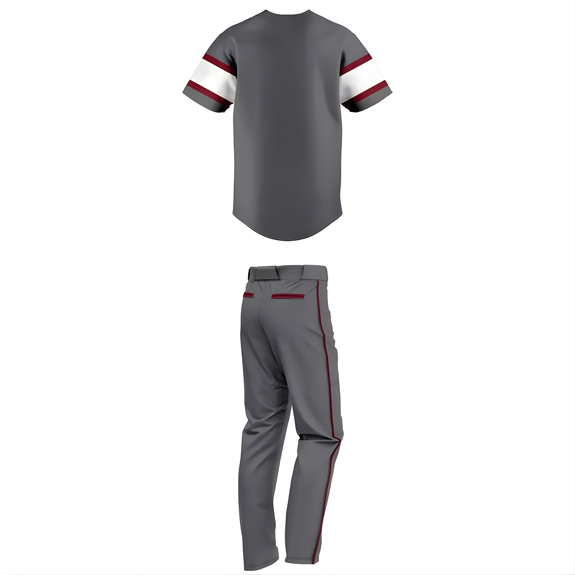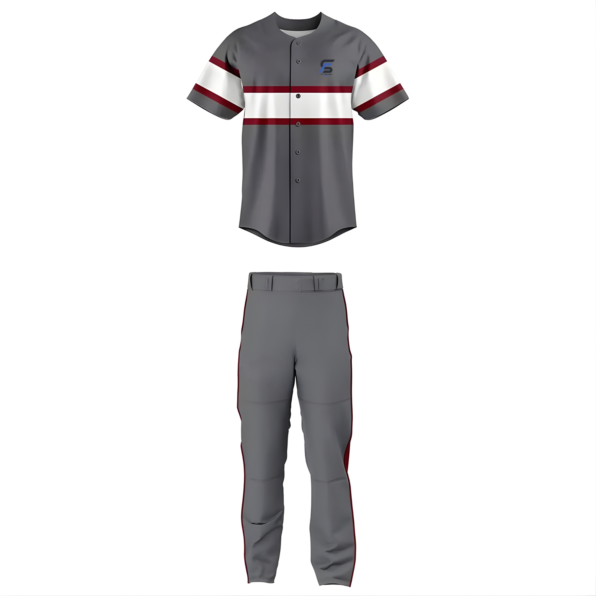 Fitterland Sports uniform paired perfectly with the jersey are tailored red baseball pants showcasing bold dark gray/black vertical side stripes that elongate the legs and scream speed. These custom baseball pants deliver comfort during matches. Whether you’re ordering for youth leagues, high school, college, or travel ball clubs, Fitterland Sports delivers fully customizable options, add your team logo, player names, and numbers with unlimited sublimation.