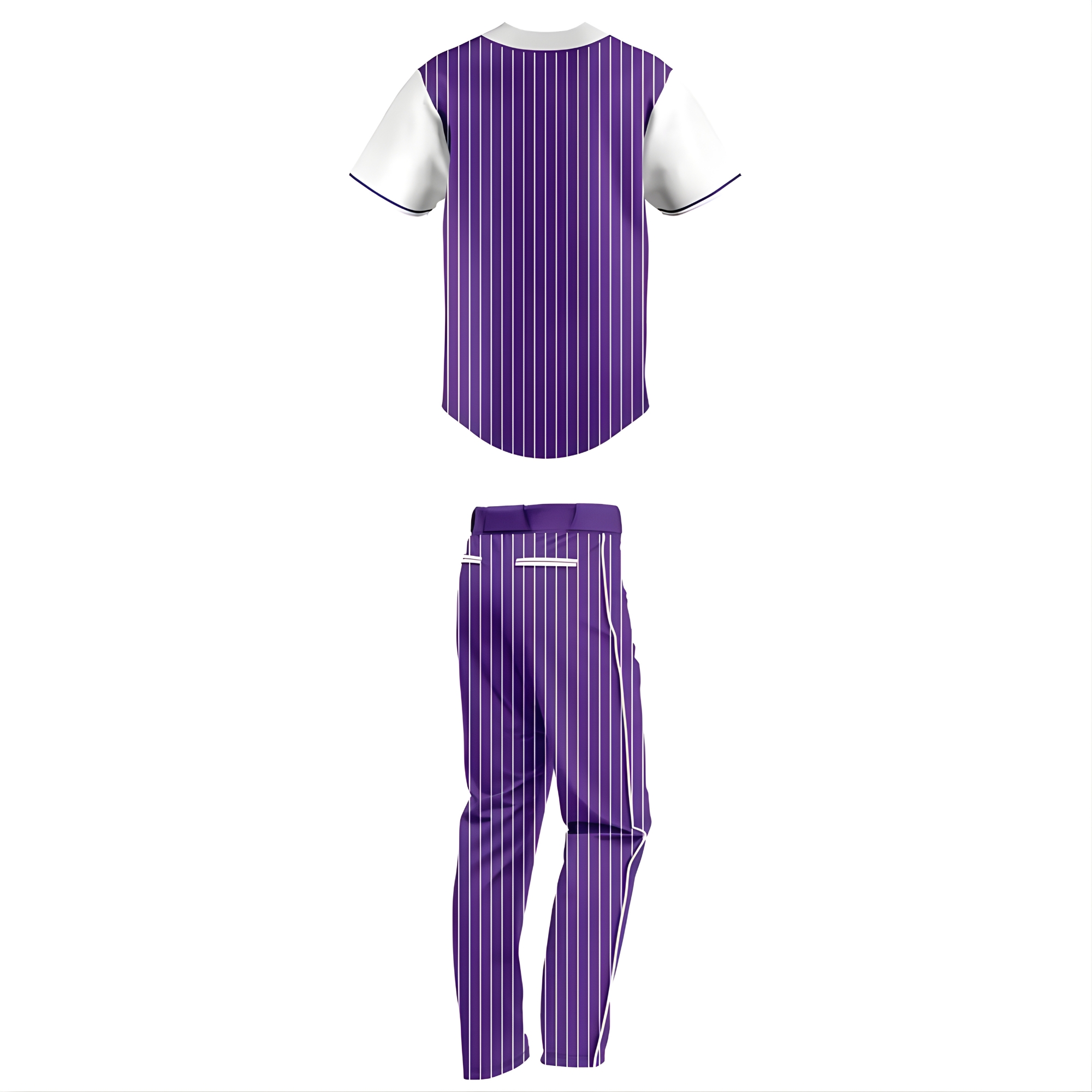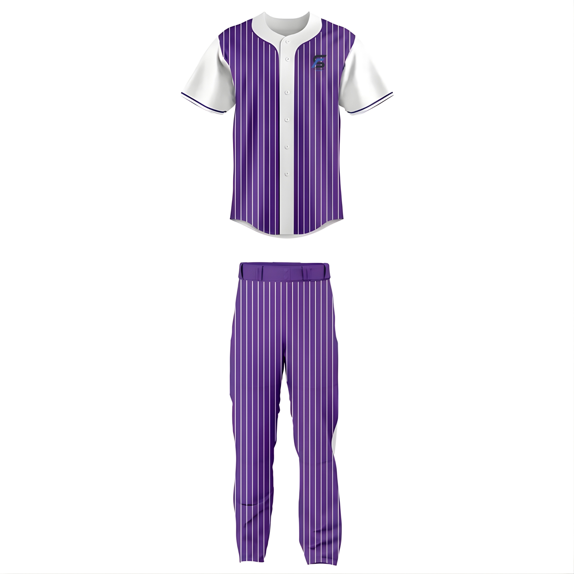 Discover premium baseball uniforms from Fitterland Sports, the leading manufacturer of high performance baseball uniform designed for champions. Fitterland Sports custom sublimated baseball uniforms purple pinstripe two-piece set features white contrast sleeves, white placket, and matching pinstriped pants with white side panels.