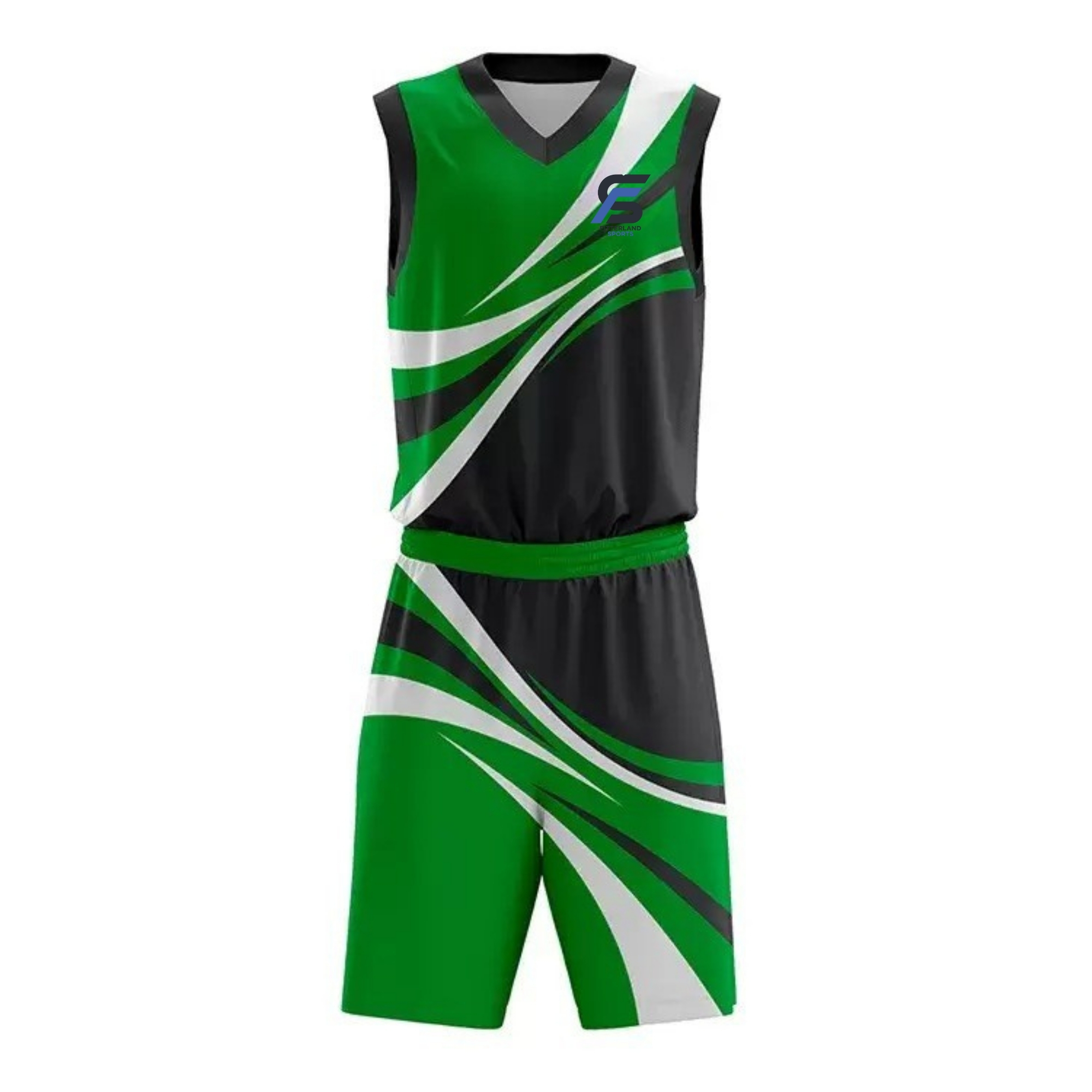 Fitterland Sports, a premium basketball uniforms manufacturer, presents its signature black and gold uniform. Fitterland Sports black and white cut-and-sew basketball uniform, engineered for champions who demand superior quality and standout design. This fully customizable sublimated basketball jersey and shorts set features a crisp white sleeveless V-neck jersey accented by bold horizontal black stripes across the torso and sleek solid black side panels for enhanced breathability and modern aesthetics. Paired with premium black shorts showcasing a comfortable white elastic waistband, sharp white vertical side stripes, and signature triple horizontal white stripes near the hem, this uniform delivers unmatched comfort and durability on the court.