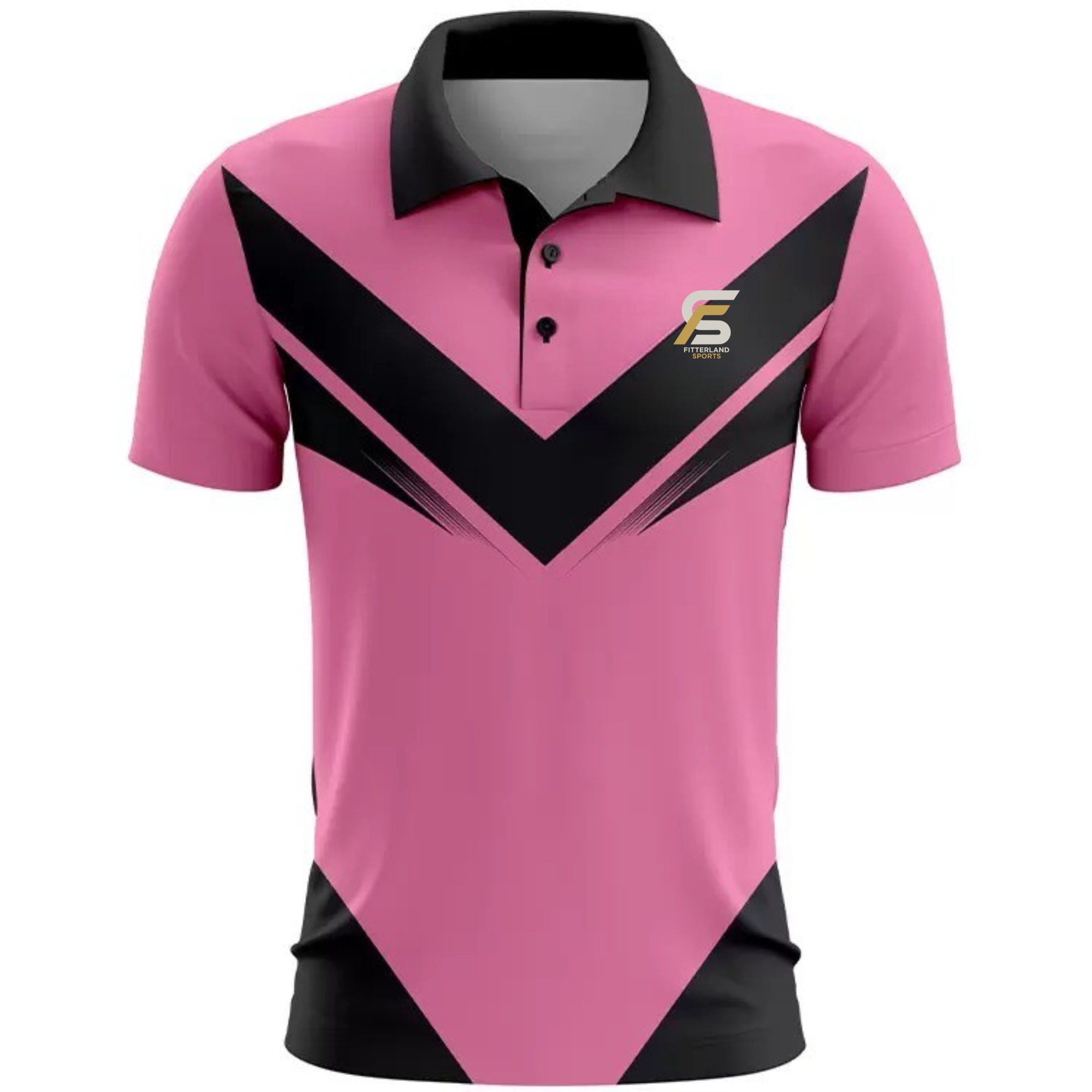 Fitterland Sports, a premium golf uniforms manufacturer, presents its signature white jersey. Fitterland Sports white sublimation golf polo uniform features a bold horizontal mid-section band exploding with green, lime green, and black geometric and zigzag patterns that demand attention on the course. A dark shield-shaped logo on the upper left chest adds sophisticated team branding, while subtle horizontal textured lines on the lower half create depth and movement. The classic two-button placket and clean collar maintain traditional golf style while delivering performance through Fitterland Sports’ industry-leading dye-sublimation process.