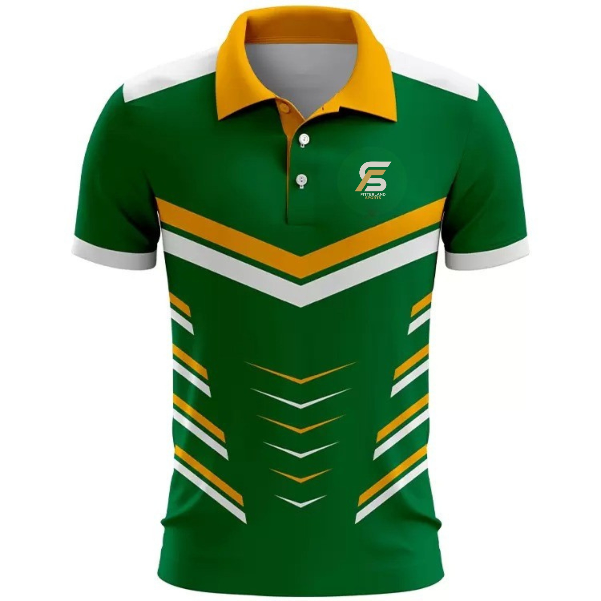 Fitterland Sports, a premium golf uniforms manufacturer, presents its signature white jersey. Fitterland Sports white sublimation golf polo uniform features a bold horizontal mid-section band exploding with green, lime green, and black geometric and zigzag patterns that demand attention on the course. A dark shield-shaped logo on the upper left chest adds sophisticated team branding, while subtle horizontal textured lines on the lower half create depth and movement. The classic two-button placket and clean collar maintain traditional golf style while delivering performance through Fitterland Sports’ industry-leading dye-sublimation process.