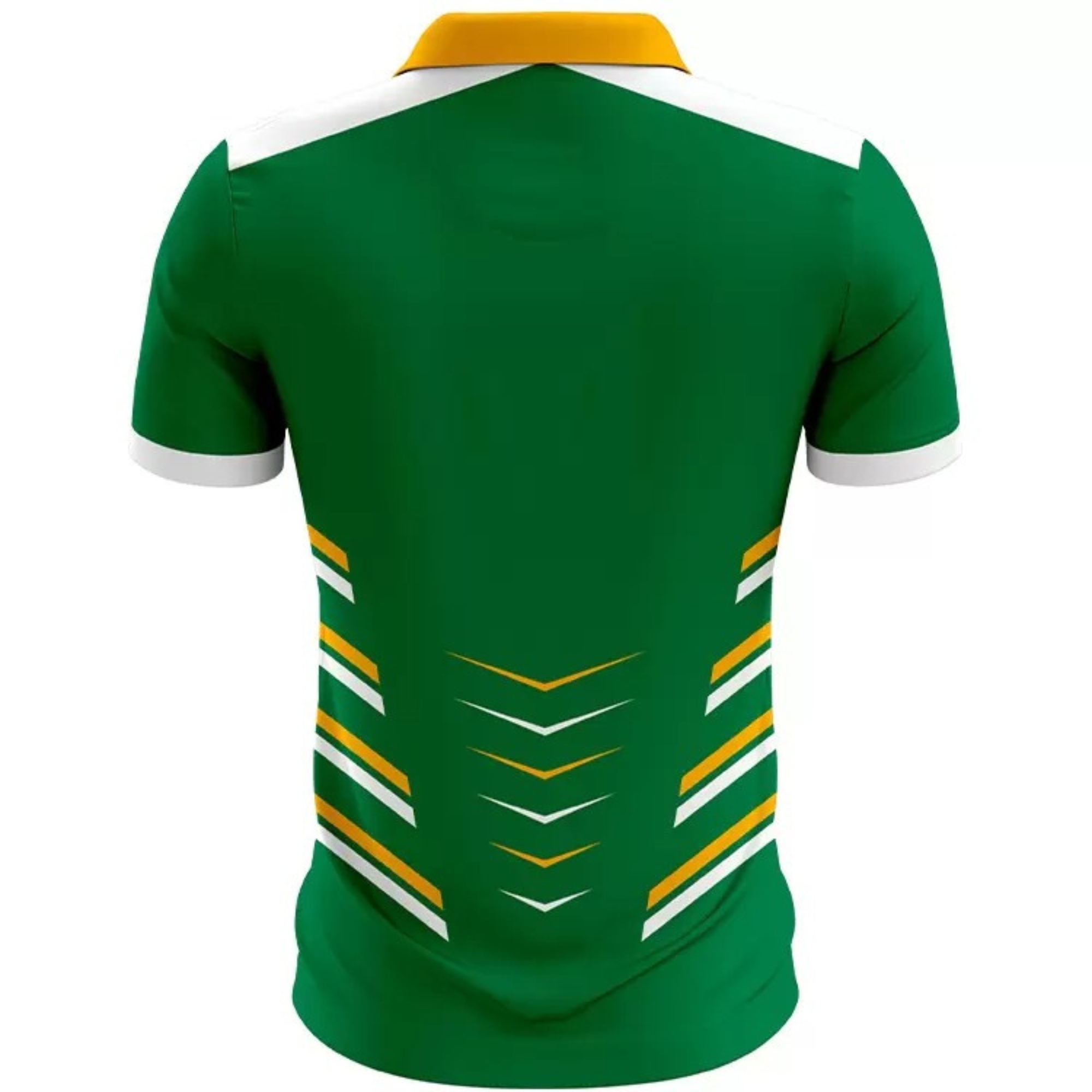 Discover premium golf uniforms from Fitterland Sports, the leading manufacturer of high-performance golf jerseys designed for champions. Fitterland Sports white sublimation golf polo featuring a striking green, lime, and black mid-section band with zigzag patterns. Premium custom sublimated golf uniform with logo, subtle textured lines, and pro-level breathability.