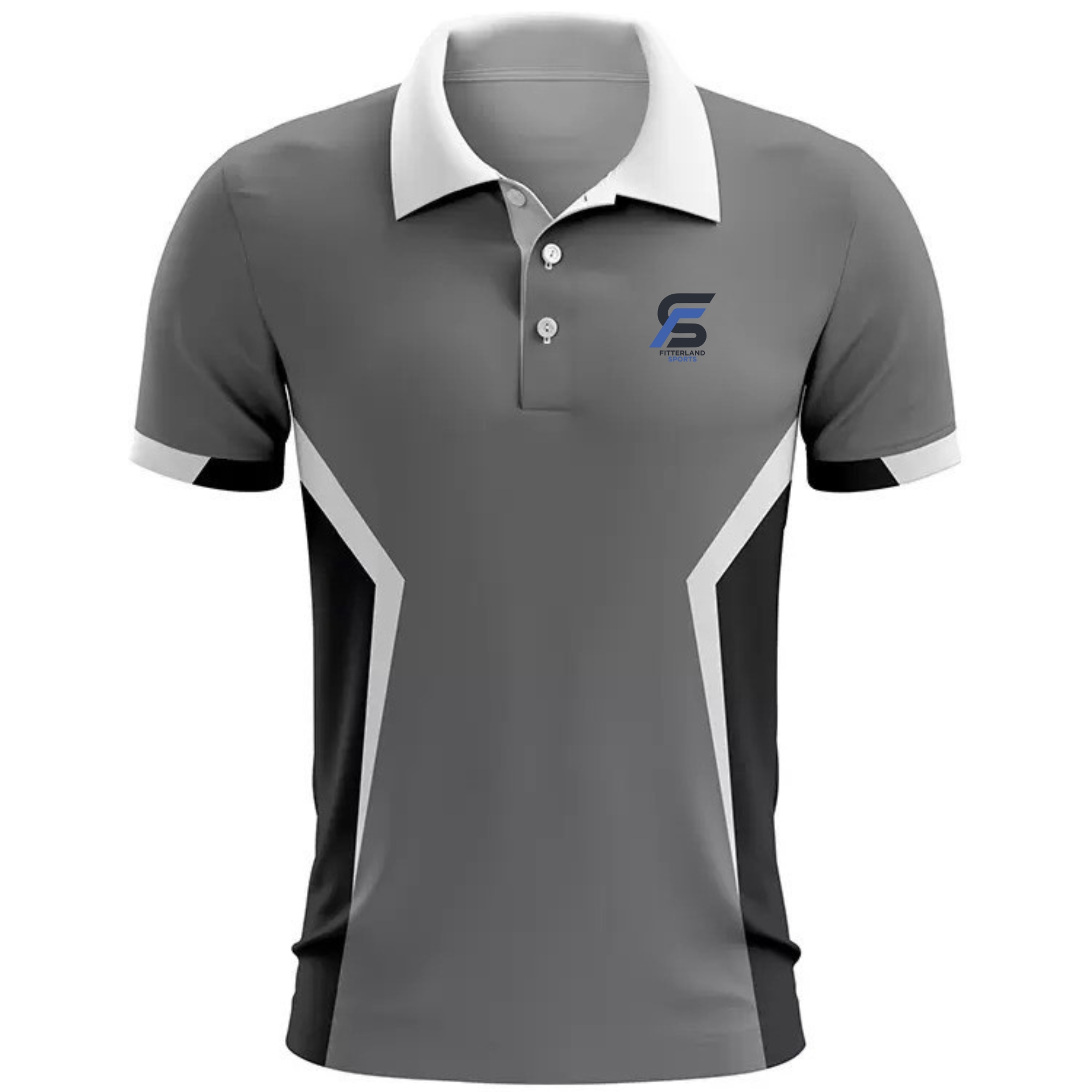 Fitterland Sports, a premium golf uniforms manufacturer, presents its signature white jersey. Fitterland Sports white sublimation golf polo uniform features a bold horizontal mid-section band exploding with green, lime green, and black geometric and zigzag patterns that demand attention on the course. A dark shield-shaped logo on the upper left chest adds sophisticated team branding, while subtle horizontal textured lines on the lower half create depth and movement. The classic two-button placket and clean collar maintain traditional golf style while delivering performance through Fitterland Sports’ industry-leading dye-sublimation process.