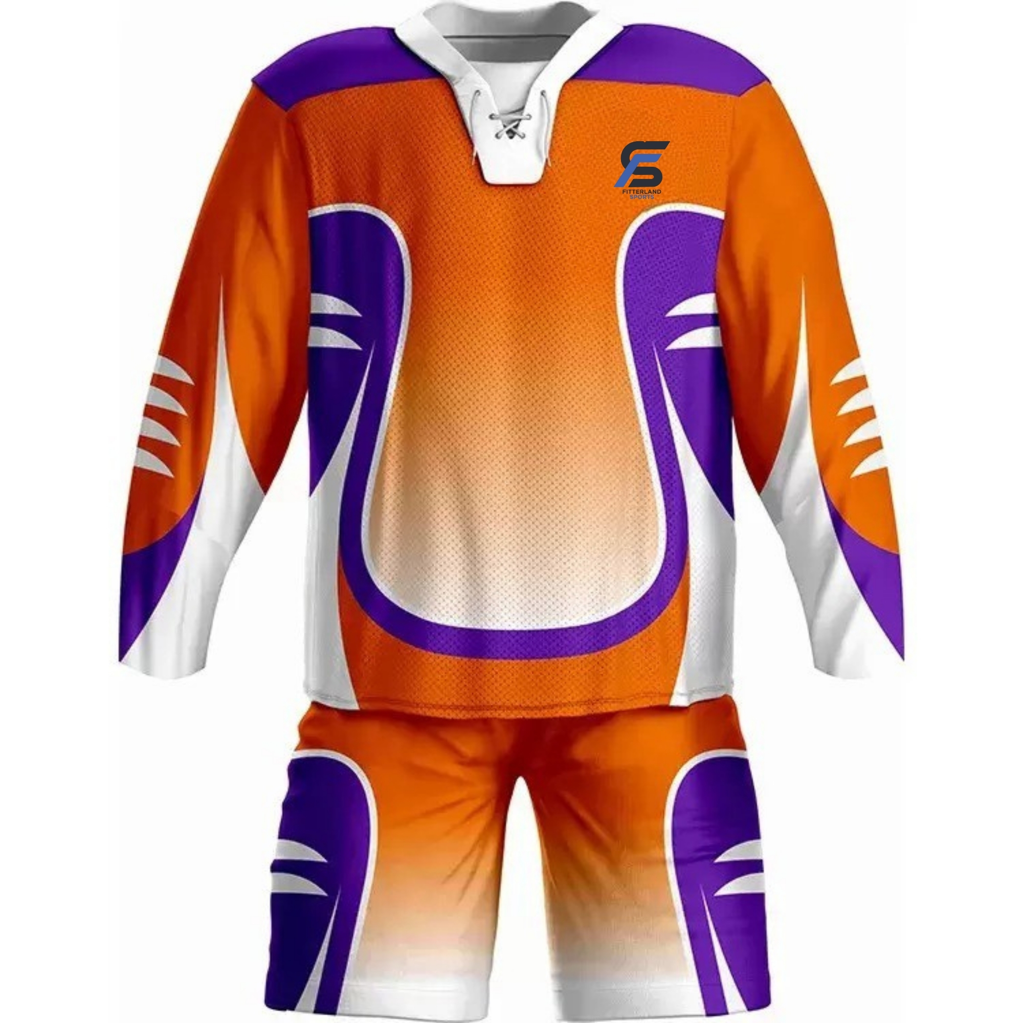 Fitterland Sports, a premium ice hockey uniforms manufacturer, presents its signature royal blue uniform. Fitterland Sports royal blue, white, and yellow-gold ice hockey uniform. Crafted with precision cut-and-sew technology, this premium custom ice hockey jersey and matching shorts set is the ultimate choice for teams demanding both style and performance. The striking royal blue base is elevated by crisp white shoulder yokes, a bold yellow-gold lace-up V-neck, and dynamic horizontal yellow-gold and white stripes across the sleeves and hem. The shield-shaped chest logo shows tradition and power. Elevate your team with Fitterland Sports’ elite custom ice hockey uniforms designed for champions.