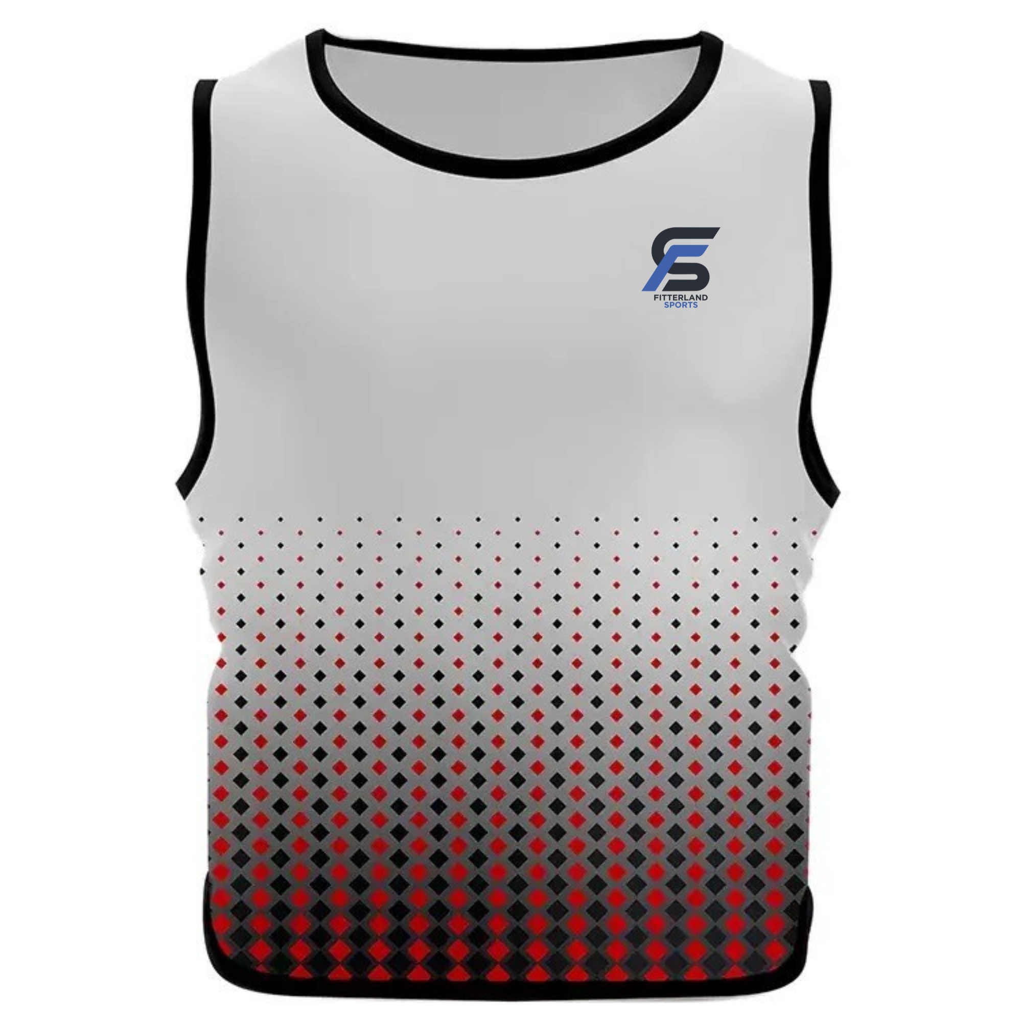 Discover premium sports bib from Fitterland Sports, the leading manufacturer of high-performance training bib designed for champions. Fitterland Sports presents a premium cut-and-sew sleeveless athletic top in a striking red and white color scheme. Featuring bold horizontal stripes and a prominent thick white chest stripe, this stretchy, smooth-fabric jersey showcases an embroidered black logo with white text on the upper left chest. Ideal for team sports, it combines vibrant design with superior comfort and performance.
