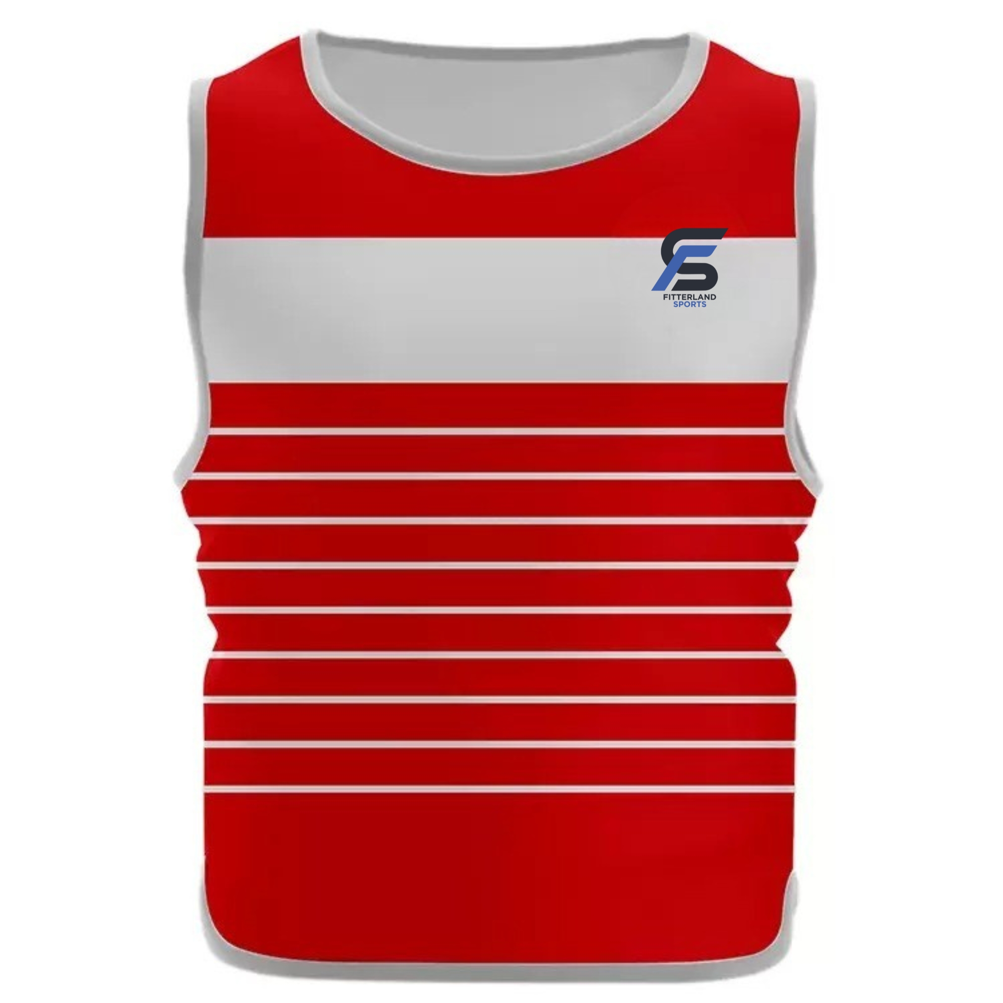 Discover premium sports bib from Fitterland Sports, the leading manufacturer of high-performance training bib designed for champions. Fitterland Sports presents a premium cut-and-sew sleeveless athletic top in a striking red and white color scheme. Featuring bold horizontal stripes and a prominent thick white chest stripe, this stretchy, smooth-fabric jersey showcases an embroidered black logo with white text on the upper left chest. Ideal for team sports, it combines vibrant design with superior comfort and performance.