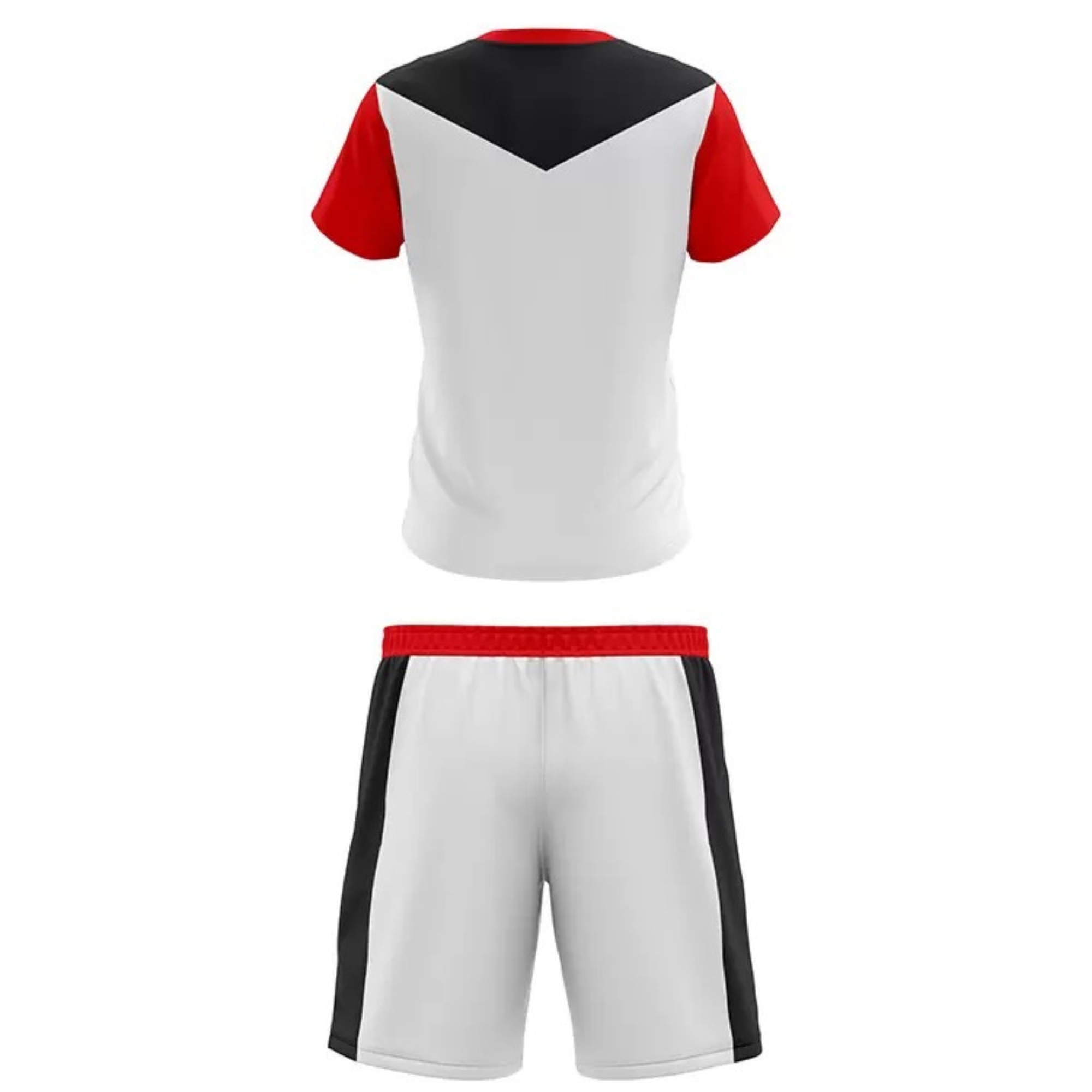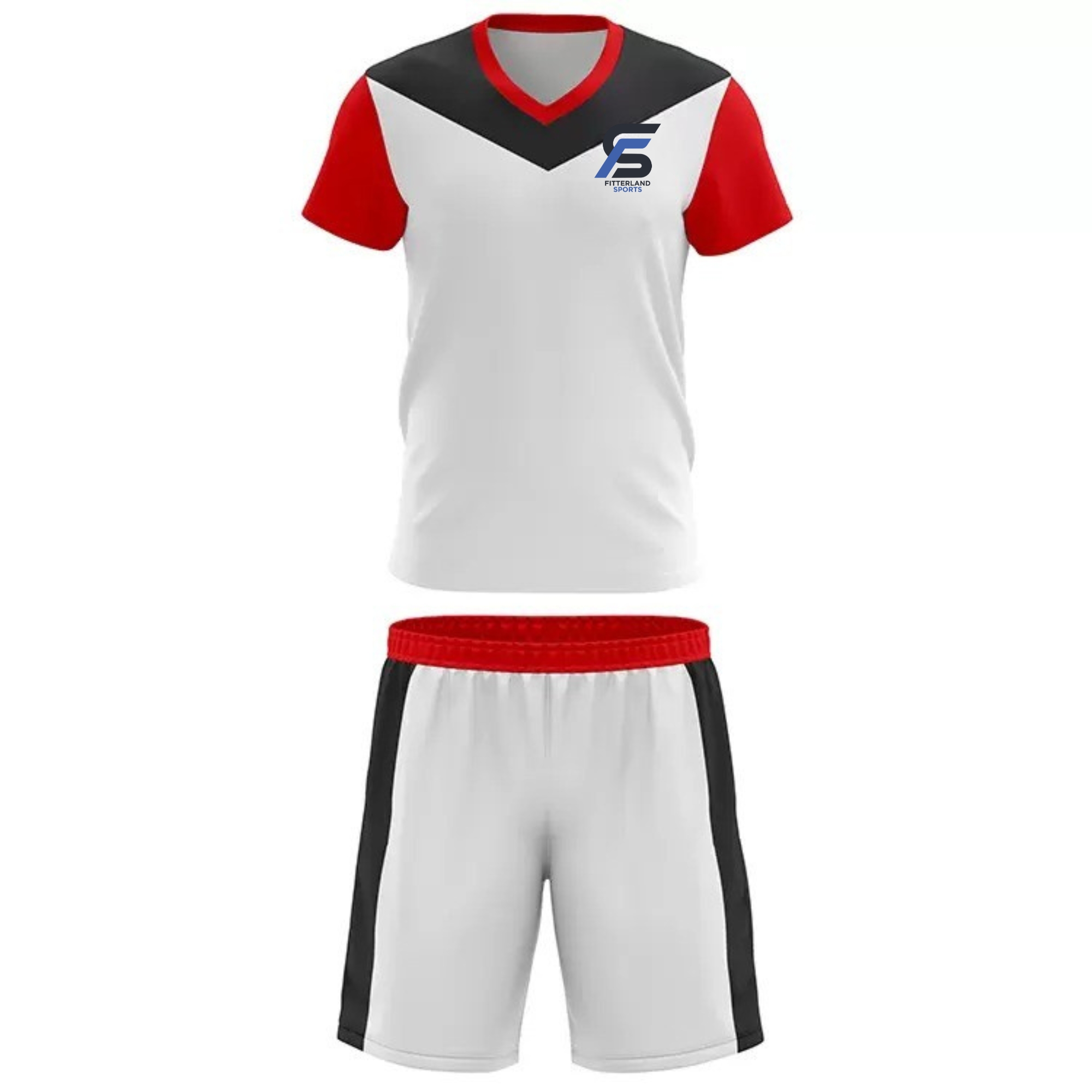 Discover premium sports uniform from Fitterland Sports, the leading manufacturer of high-performance tennis uniform designed for champions. Fitterland Sports presents a dynamic white and red uniform set, crafted through expert cut-and-sew techniques. The short-sleeved V-neck shirt features a striking black diagonal stripe across the chest, paired with matching shorts boasting black vertical side stripes. Red trim accents the neckline and hems, while lightweight, smooth fabric ensures optimal comfort and performance during intense athletic activities.