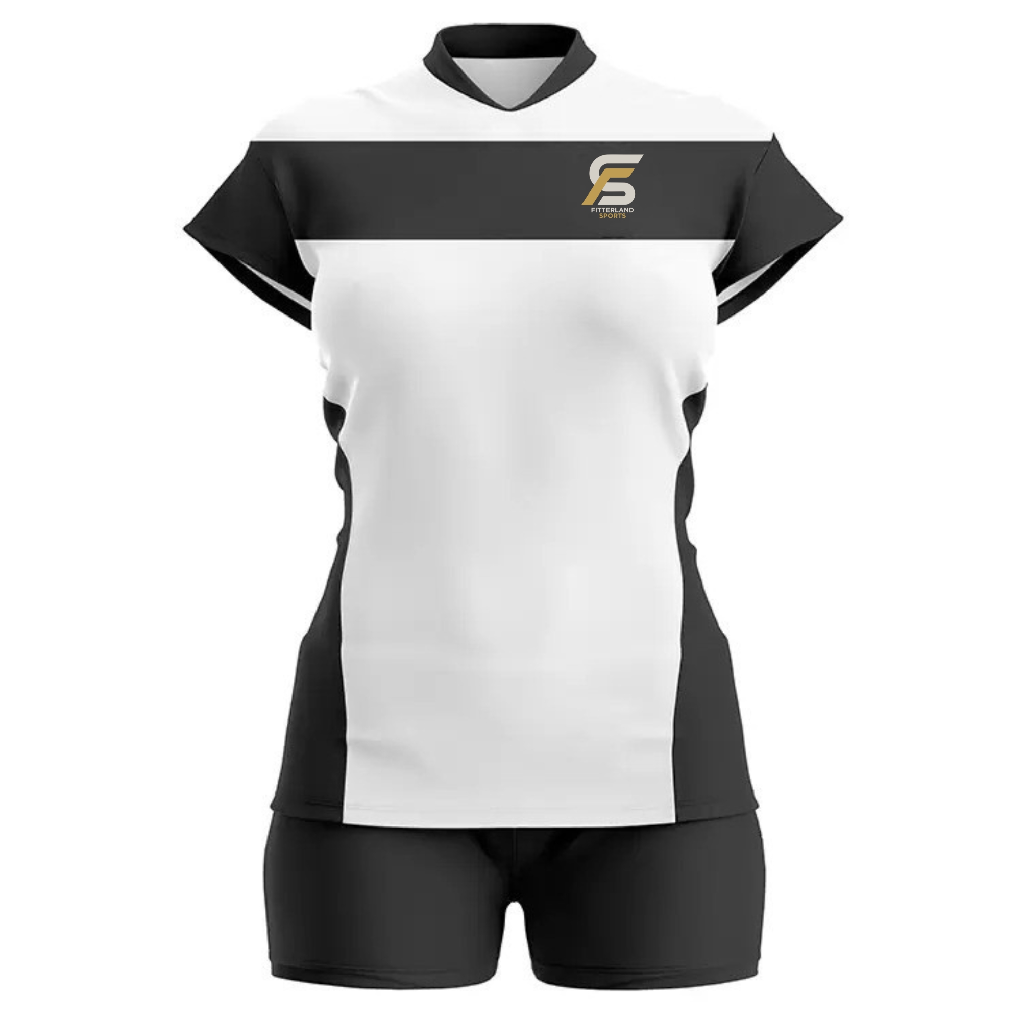 Fitterland Sports, a premium volleyball uniform manufacturer, presents its signature white and blue uniform. Colaro Sports proudly introduces a timeless cut-and-sew sports uniform in a sophisticated white and navy blue color scheme. The short-sleeved jersey features a distinctive V-shaped navy blue design across the front, creating a dynamic visual appeal, while a matching navy logo the upper left chest for brand prominence. Paired seamlessly with navy blue shorts, the ensemble exudes professionalism and team spirit.