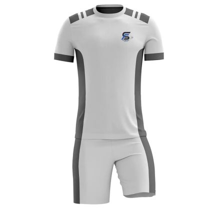 Fitterland Sports, a premium volleyball uniform manufacturer, presents its signature white and blue uniform. Colaro Sports proudly introduces a timeless cut-and-sew sports uniform in a sophisticated white and navy blue color scheme. The short-sleeved jersey features a distinctive V-shaped navy blue design across the front, creating a dynamic visual appeal, while a matching navy logo the upper left chest for brand prominence. Paired seamlessly with navy blue shorts, the ensemble exudes professionalism and team spirit.